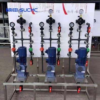 水處理加藥裝置由計量泵及脈沖阻尼器、背壓閥、安全閥等附件及管路支架組成。三臺計量泵兩用一備,防止在使用過程中出現故障時能夠及時替換工作。水處理加藥裝置接入現場加藥箱就可以工作,安裝簡單,使用方便,有效地提高工作效率。